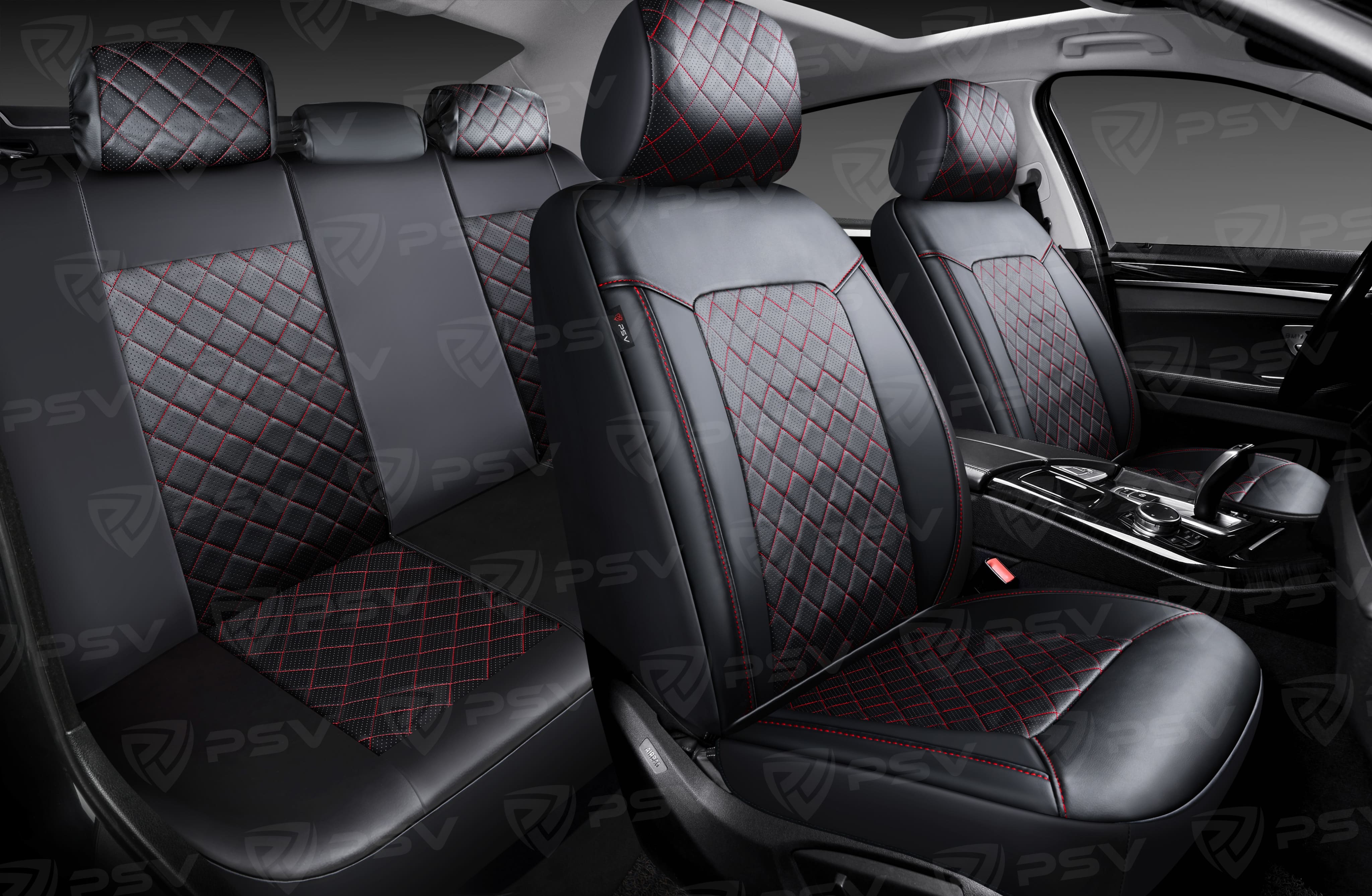 Чехлы PSV Elegant Next (Черный/Ромб красный/отстрочка красная), ромб + экокожа (ХИТ ПРОДАЖ)
